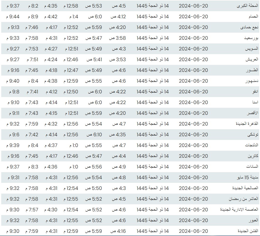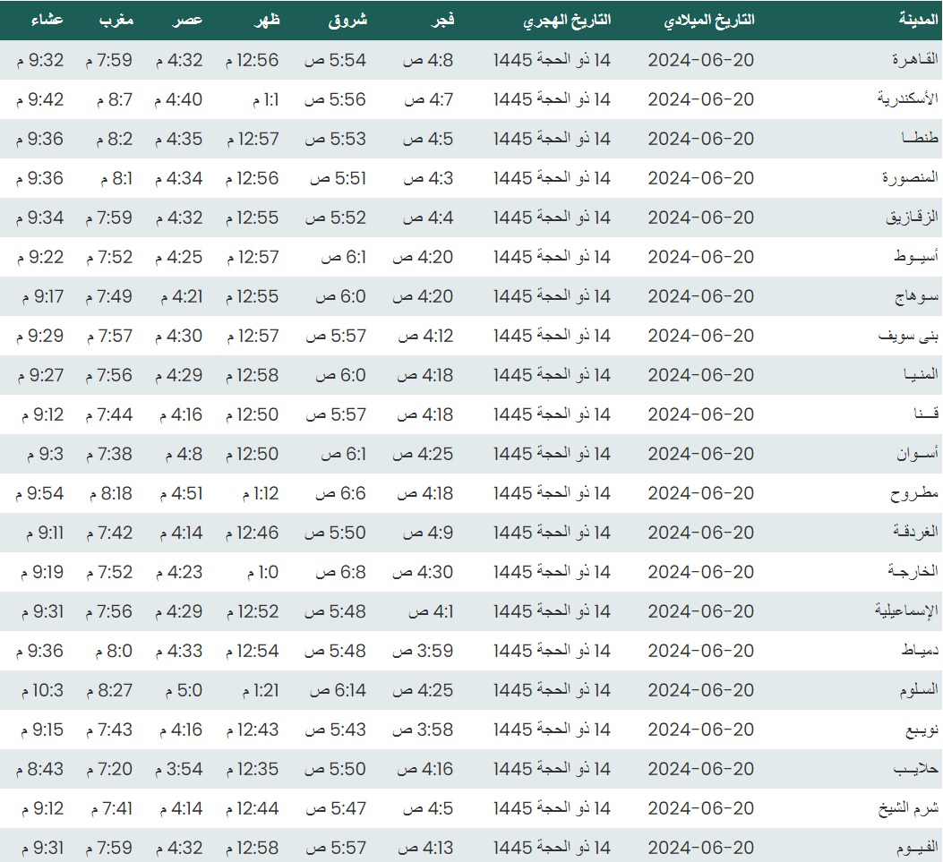 مواقيت الصلاة اليوم وفقًا للتوقيت المحلي لمدينتي القاهرة والإسكندرية وكذلك،مواقيت الصلاة، لعدد من مدن ومحافظات الجمهورية من واقع بيانات الهيئة العامة للمساحة