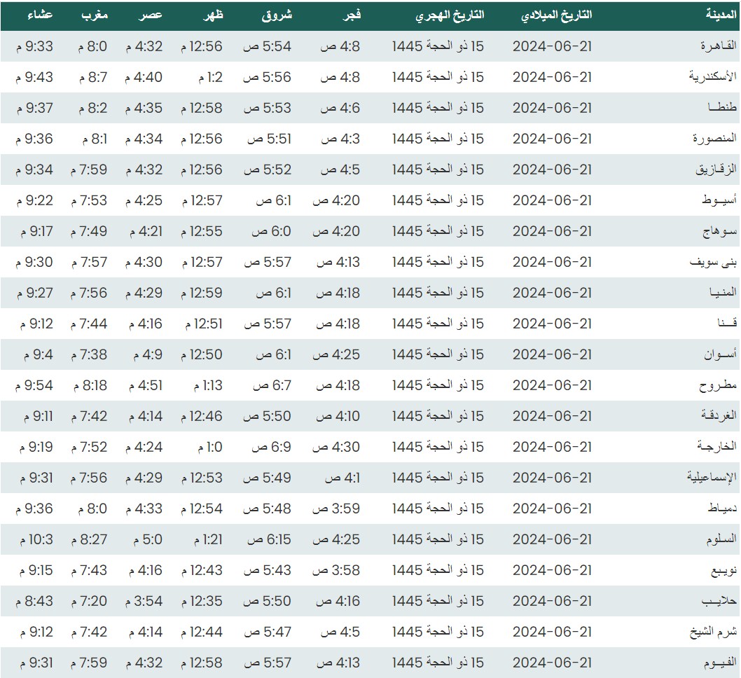 مواقيت الصلاة اليوم وفقًا للتوقيت المحلي لمدينتي القاهرة والإسكندرية وكذلك،مواقيت الصلاة، لعدد من مدن ومحافظات الجمهورية من واقع بيانات الهيئة العامة للمساحة