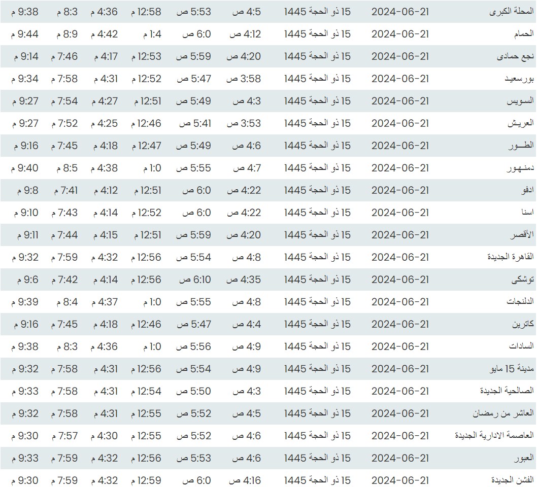 وفيما يلي مواقيت الصلاة، لعدد من مدن ومحافظات الجمهورية من واقع بيانات الهيئة العامة للمساحة