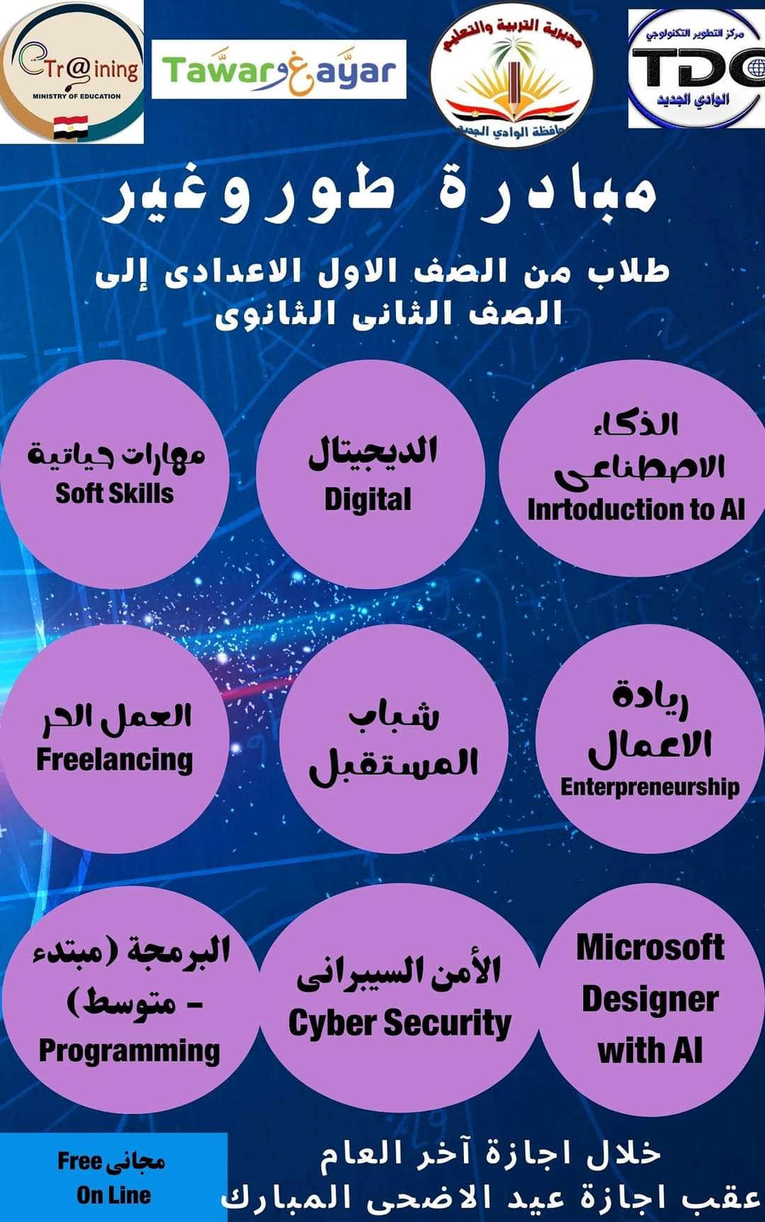 أعلنت مديرية التربية والتعليم بمحافظة الوادي الجديد، تفعيل ورش عمل تكنولوجية للطلاب في مبادرة «طور وغير» خلال إجازة نهاية العام الدراسي الجاري 2023 / 2024.