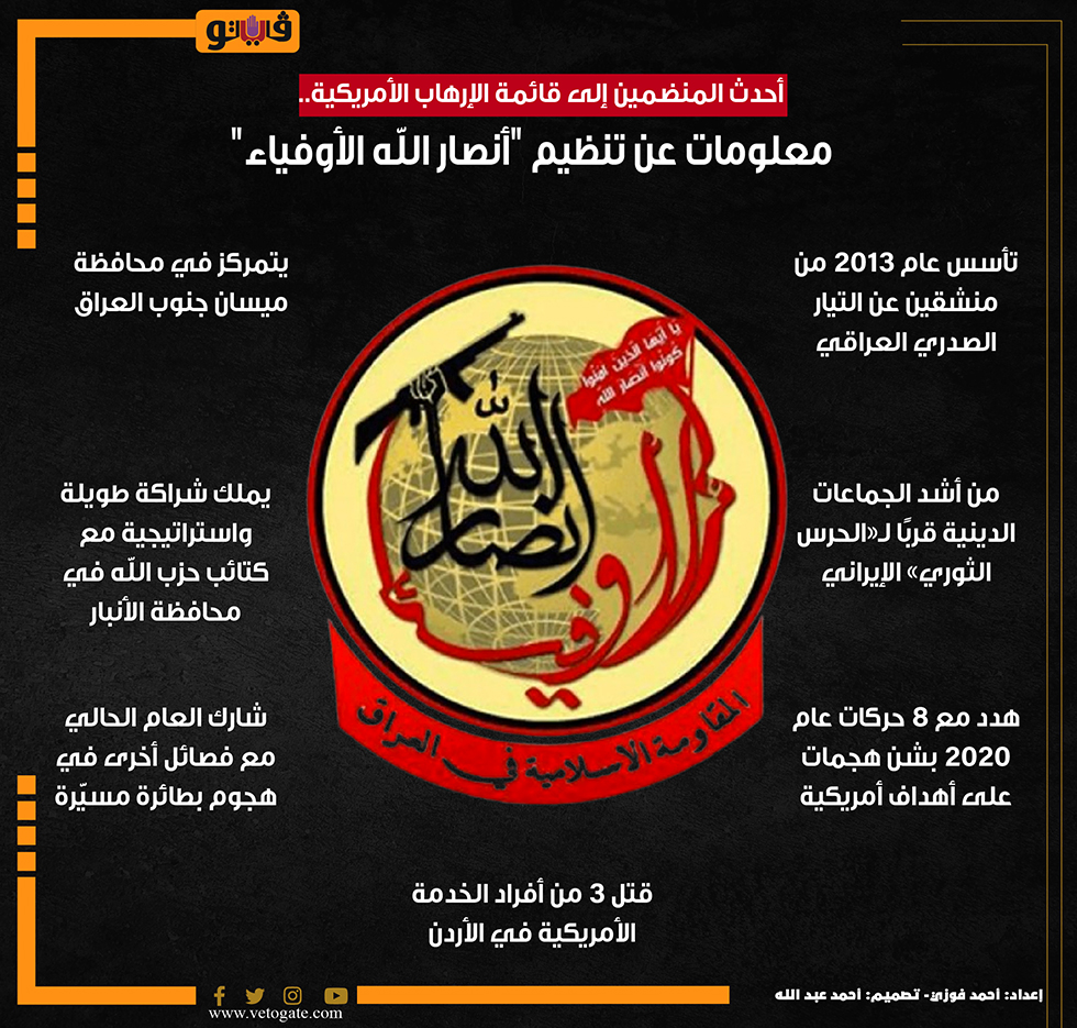 أحدث المنضمين إلى قائمة الإرهاب الأمريكية.. معلومات عن تنظيم "أنصار الله الأوفياء" (إنفوجراف) الأحد 23/يونيو/2024 - 09:53 م 6/23/2024 9:53:08 PM أنصار الله الأوفياء، العراق احمد فوزي شارك طباعة 18 حجم الخط شارك طباعة جند الله الأوفياء الحرس الثوري الإيراني الإرهاب الجماعات الدينية قائمة الإرهاب الأمريكية قائمة الارهاب كتائب حزب الله محافظة الأنبار