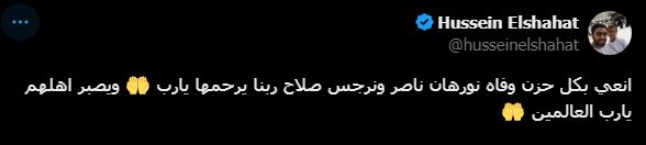 ونشر لاعب النادي الأهلي تغريدة بموقع إكس “تويتر سابقا” قائلا: “أنعي بكل حزن وفاة نورهان ناصر ونرجس صلاح ربنا يرحمها يارب ويصبر أهلهم يارب العالمين”.
