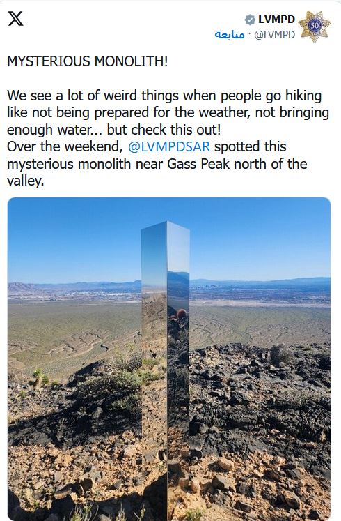 حيّر هيكل غامض على شكل عمود برّاق ضباط الشرطة في لاس فيجاس الأمريكية بعد أن شوهد وهو يتلألأ في سلسلة جبال نائية.