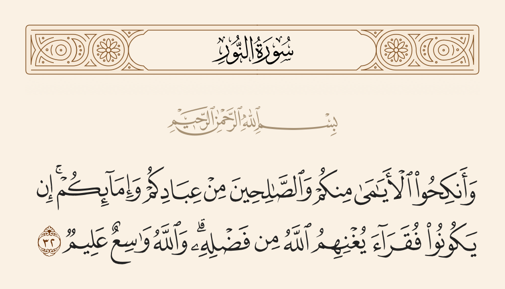 قال تعالى: «وَأَنْكِحُوا الْأَيَامَى مِنْكُمْ وَالصَّالِحِينَ مِنْ عِبَادِكُمْ وَإِمَائِكُمْ إِنْ يَكُونُوا فُقَرَاءَ يُغْنِهِمُ اللَّهُ مِنْ فَضْلِهِ وَاللَّهُ وَاسِعٌ عَلِيمٌ».