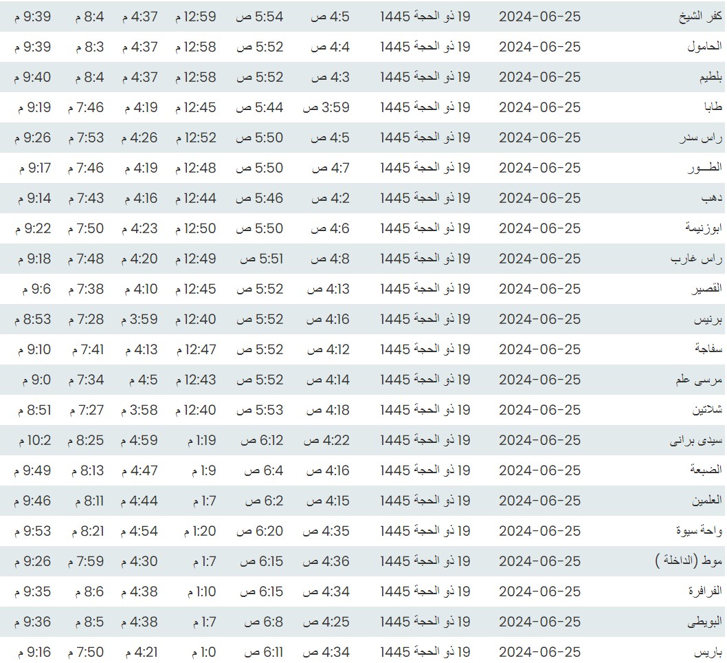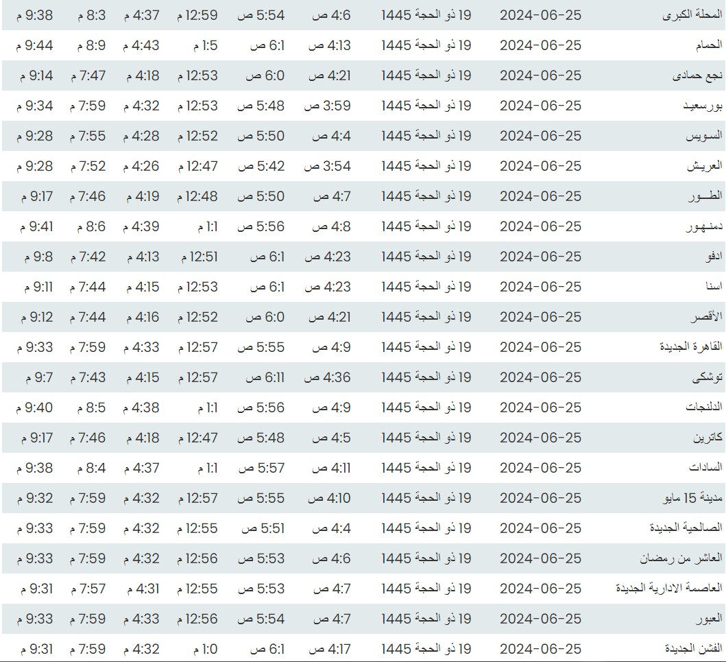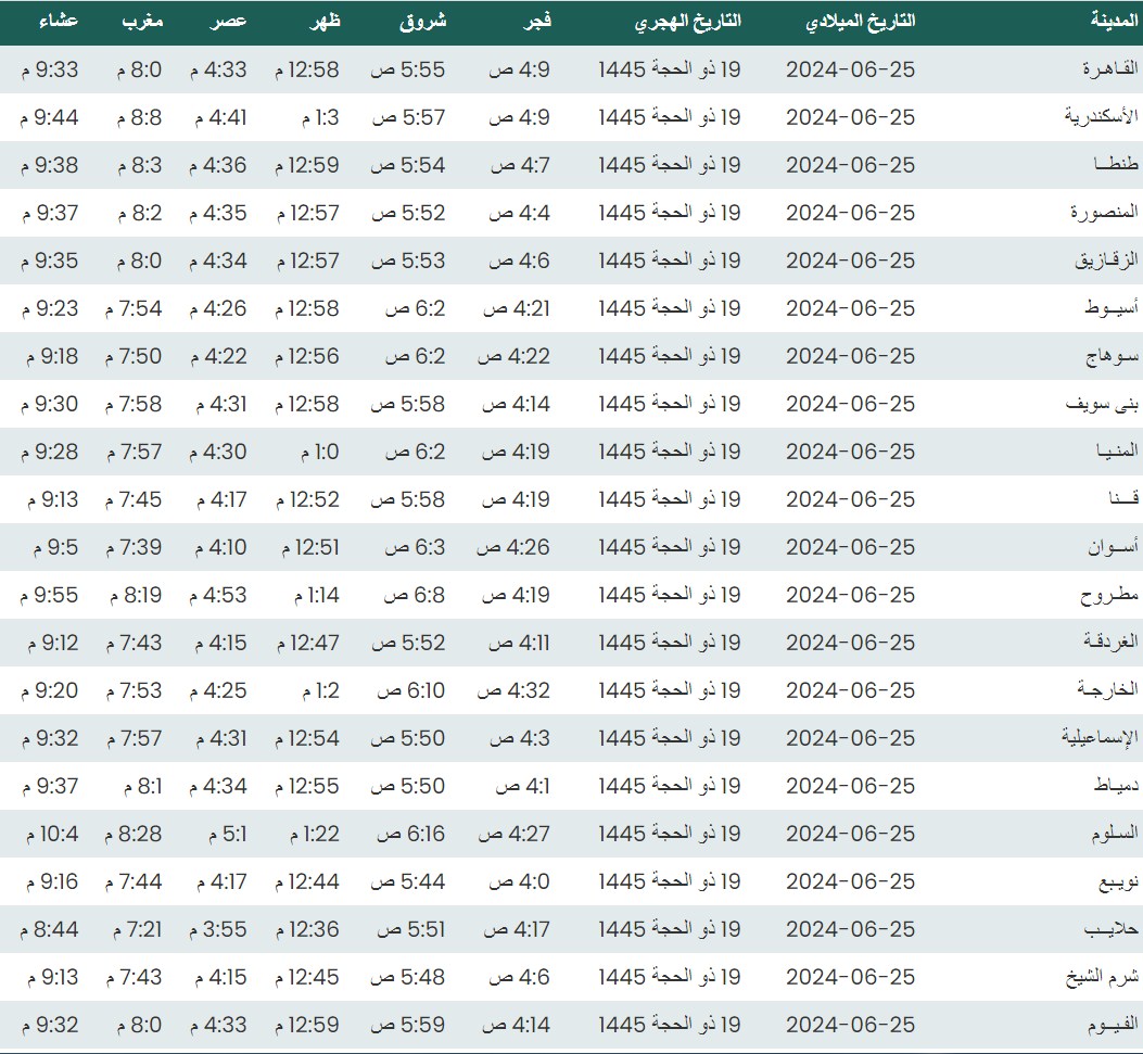وفيما يلي مواقيت الصلاة، لعدد من مدن ومحافظات الجمهورية من واقع بيانات الهيئة العامة للمساحة