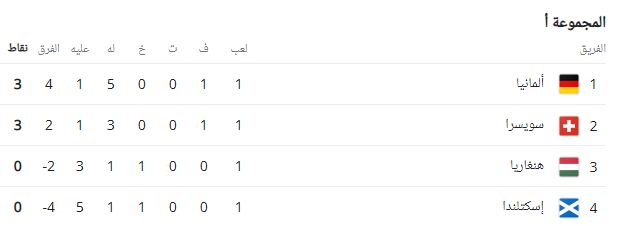 ويحتل منتخب سويسرا وصافة المجموعة الأولي بالتساوي مع ألمانيا، صاحبة الصدارة بفارق الأهداف فقط، بينما يتذيل منتخبي اسكتلندا والمجر الترتيب بدون أي رصيد من النقاط.