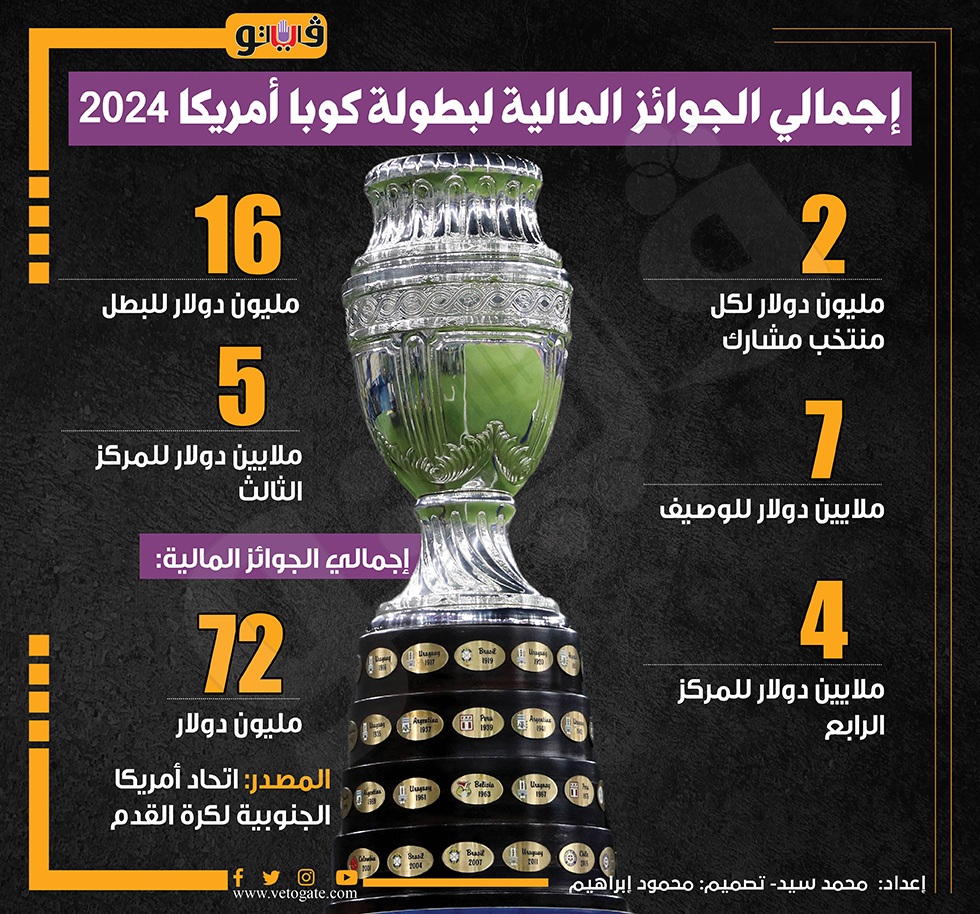 إجمالي الجوائز المالية لبطولة كوبا أمريكا 2024 (إنفوجراف) الخميس 20/يونيو/2024 - 12:18 م 6/20/2024 12:18:10 PM كوبا أمريكا، فيتو محمد سيد شارك طباعة 18 حجم الخط شارك طباعة كوبا امريكا كوبا أمريكا 2024 أمريكا اتحاد امريكا الجنوبية لكرة القدم