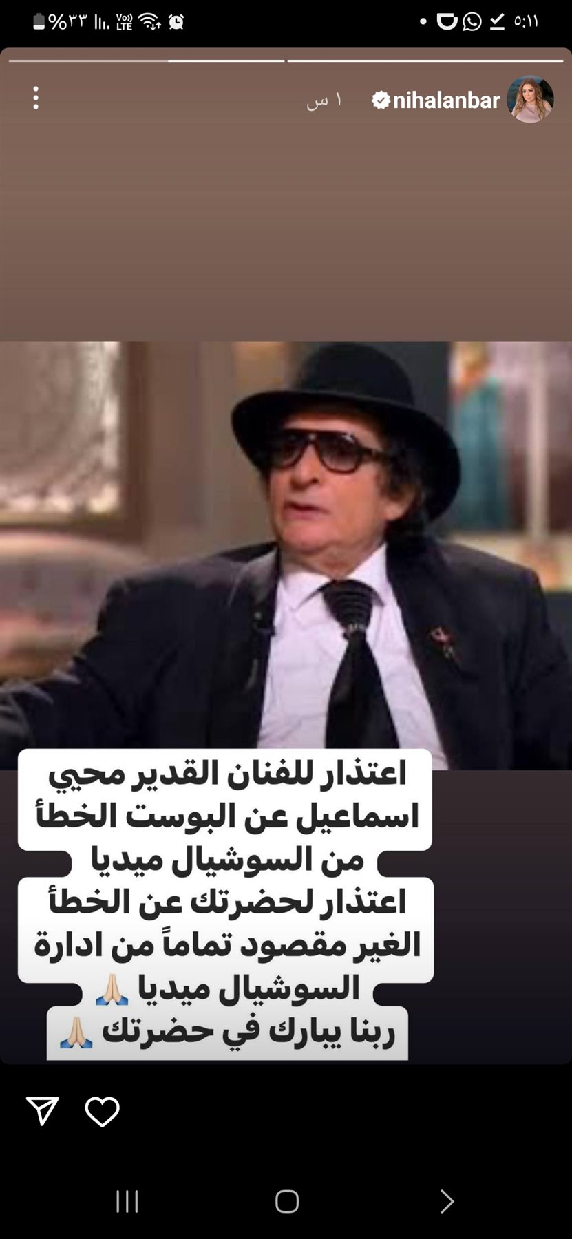 عقب إعلانها خبر خاطئ عن وفاة الفنان القدير محيي إسماعيل، اعتذرت الفنانة نهال عنبر إلى الفنان محيى إسماعيل عقب وصفها إياه بالفنان الرحل.