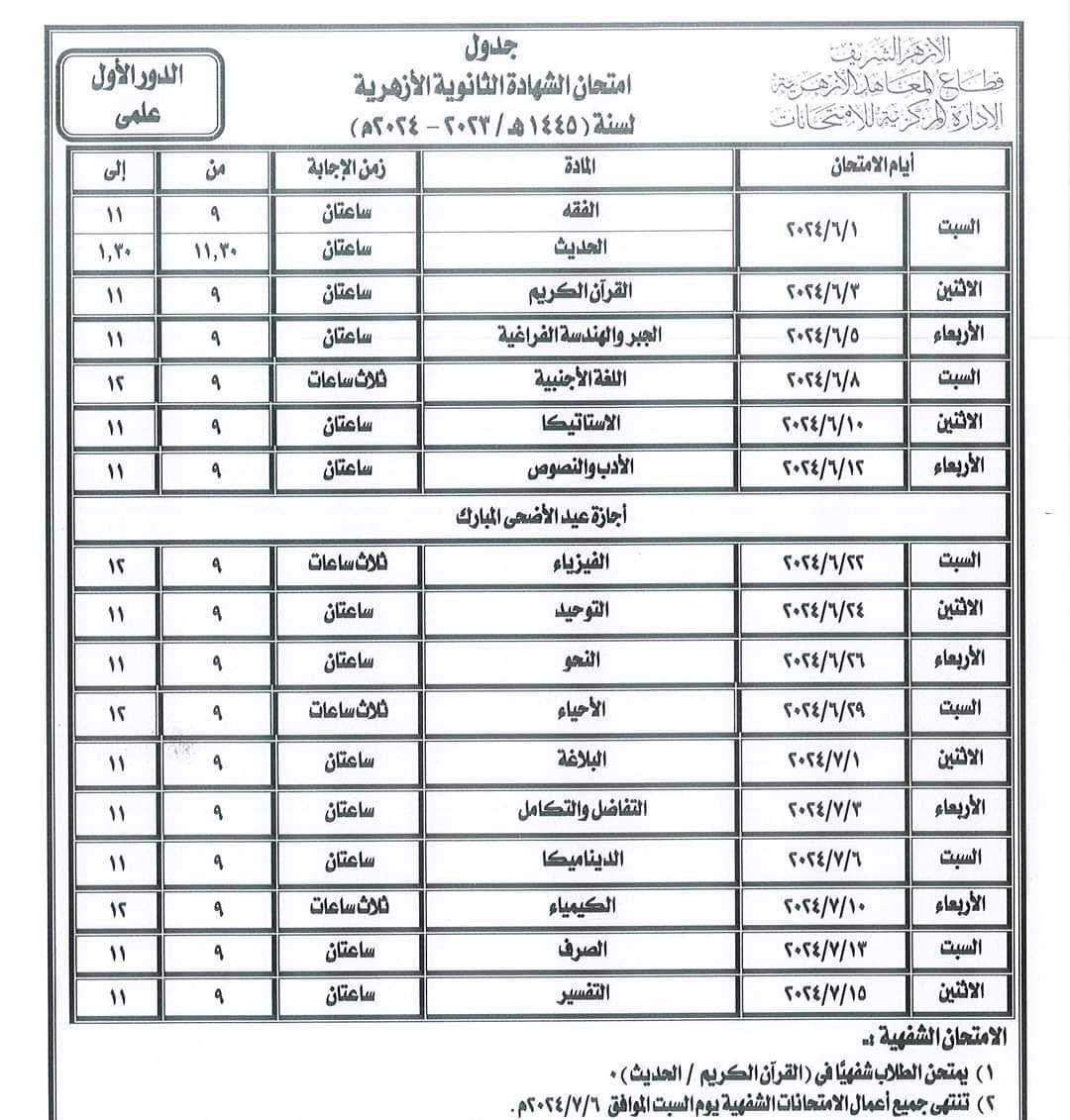 ومن المقرر أن تستأنف الامتحانات بعد إجازة عيد الأضحى يوم السبت 22 يونيو بـامتحان مادة الفيزياء لطلاب القسم العلمي، والاثنين 24 يونيو التوحيد، والأربعاء 26 يونيو النحو، ويوم السبت 29 يونيو الأحياء، ويوم الاثنين 1 يوليو البلاغة، ويوم الأربعاء 3 يوليو مادة التفاضل والتكامل، ويوم السبت 6 يوليو مادة الديناميكا، ويوم الأربعاء 10 يوليو الكيمياء، ويوم السبت 13 يوليو الصرف، الاثنين 15 يوليو مادة التفسير.