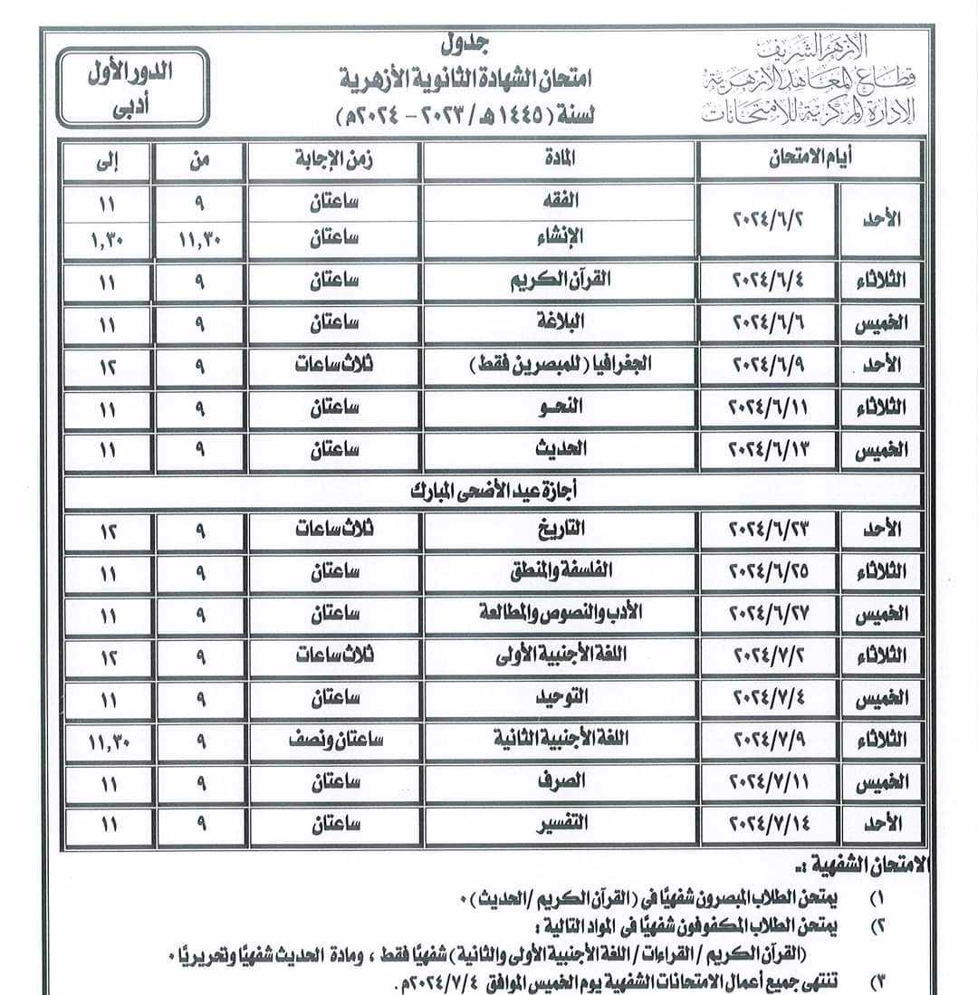 ويؤدي القسم الأدبى الأحد 23 يونيو امتحان التاريخ، والثلاثاء 25 يونيو الفلسفة والمنطق، والخميس 27 يونيو الأدب والمطالعة والنصوص، والأحد 2 يوليو اللغة الأجنبية الأولى، الثلاثاء 9 يوليو اللغة الأجنبية الثانية، والخميس 11 يوليو الصرف، والأحد 14 يوليو التفسير.