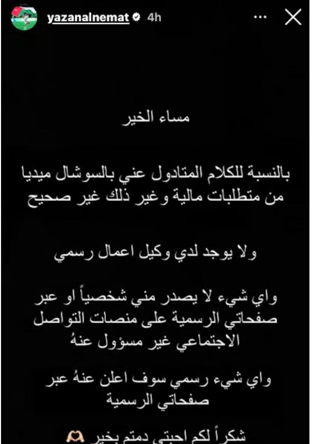 وقال يزن النعيمات في بيان عبر خاصية "ستوري" بحسابه الشخصي على منصة "إنستجرام": “بالنسبة للكلام المتداول عني بالسوشيال ميديا من متطلبات مالية وغير ذلك غير صحيح، ولا يوجد لدي وكيل أعمال رسمي”.