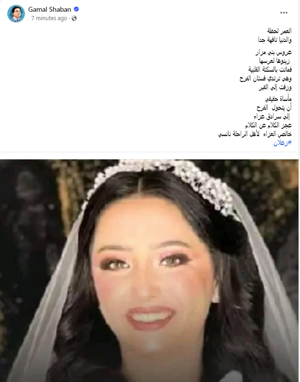 وتابع الدكتور جمال شعبان: "مأساة حقيقية أن يتحول الفرح إلى سرادق عزاء، عجز الكلام عن الكلام، خالص العزاء لأهل الراحلة نانسي.. زعلان".
