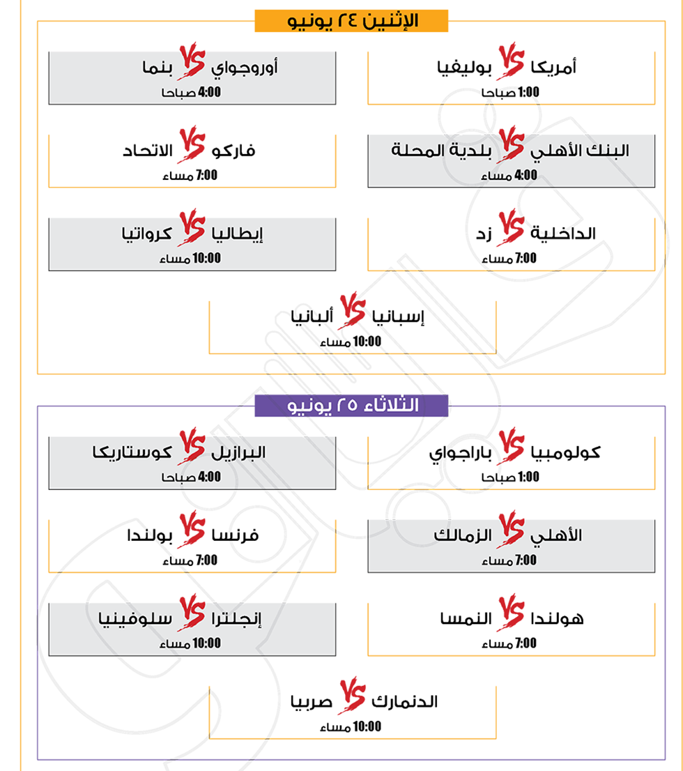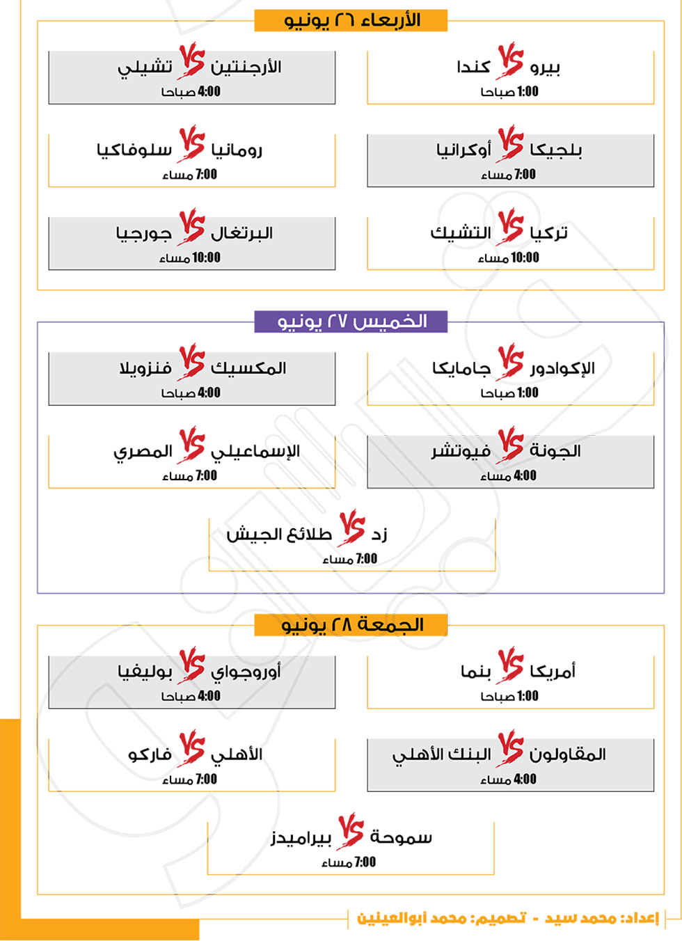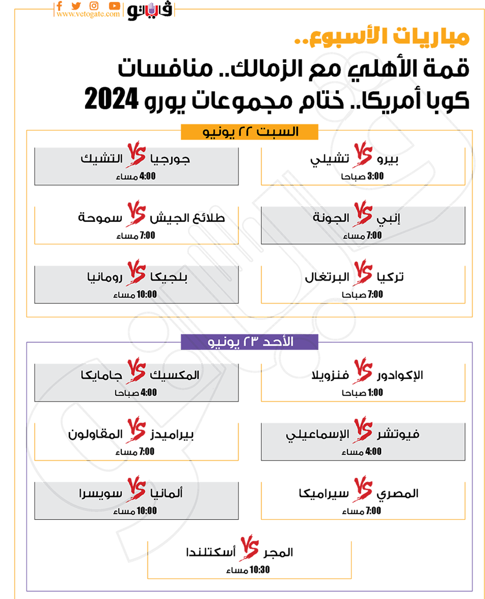 مباريات الأسبوع، قمة الأهلي مع الزمالك.. منافسات كوبا أمريكا.. ختام مجموعات يورو 2024 (إنفوجراف) الجمعة 21/يونيو/2024 - 05:34 م 6/21/2024 5:34:31 PM الأهلي والزمالك، فيتو محمد سيد شارك طباعة 18 حجم الخط شارك طباعة الأهلي الزمالك الأرجنتين البرازيل أمريكا