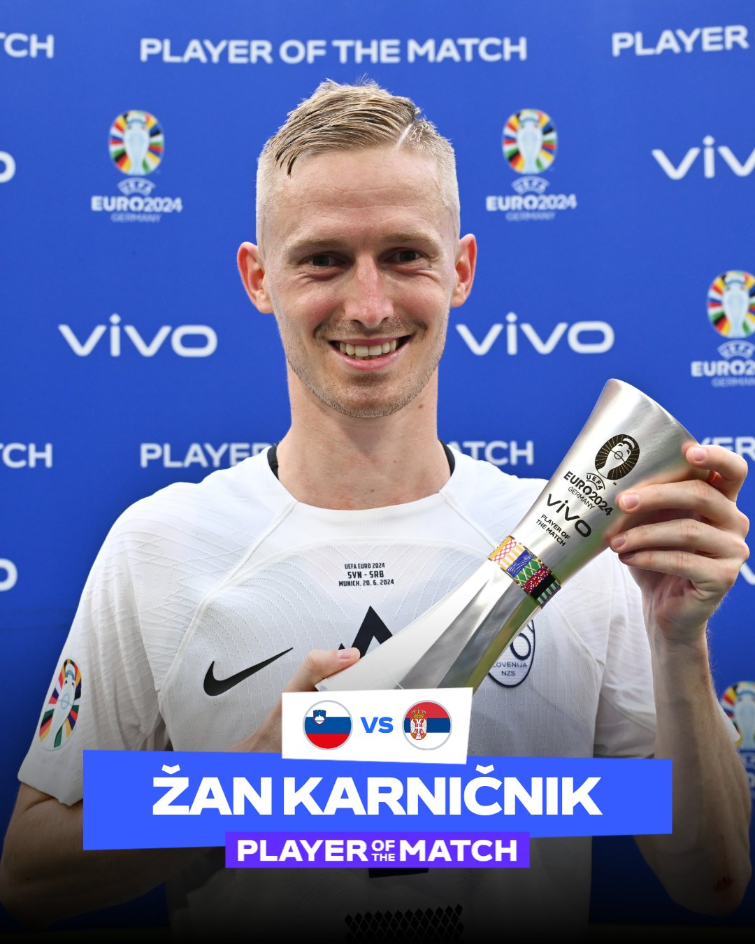 حصد اللاعب زان كارنيكنيك نجم منتخب سلوفينيا على جائزة رجل مباراة بلاده أمام صربيا، التي أقيمت مساء اليوم الخميس، على ملعب أليانز أرينا في الجولة الثانية من المجموعة الثالثة ببطولة كأس أمم أوروبا - يورو 2024.