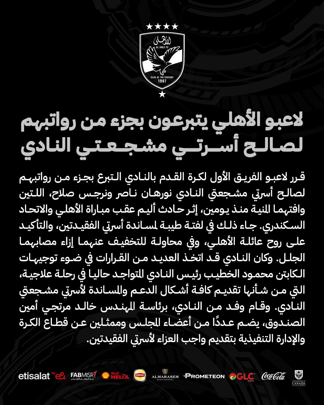 قرر لاعبو الفريق الأول لكرة القدم بالنادي الأهلي التبرع بجزء من رواتبهم، لصالح أسرتي مشجعتي النادي نورهان ناصر ونرجس صلاح، واللتين وافتهما المنية، إثر الحادث الأليم الذي تعرضتا له الثلاثاء الماضي، وأودى بحياتهما، عقب مباراة الأهلي والاتحاد السكندري التي أقيمت بملعب برج العرب.