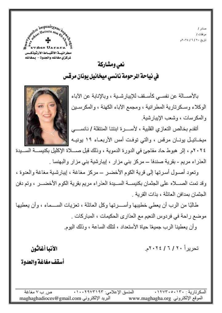 مطرانية مغاغة والعدوة للأقباط الأرثوذكس تنعى عروس المنيا