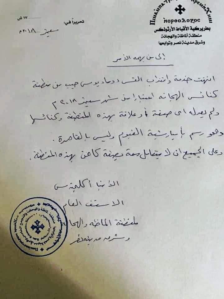 وذلك قبل أن يصدر نيافة الانبا اكليمندس الاسقف العام لمنطقة ألماظة والهجانه وشرق مدينه نصر، قرارا بإنهاء خدمته في عام 2018.