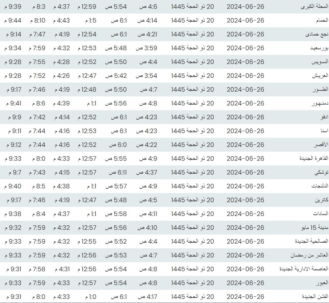 وفيما يلي مواقيت الصلاة، لعدد من مدن ومحافظات الجمهورية من واقع بيانات الهيئة العامة للمساحة