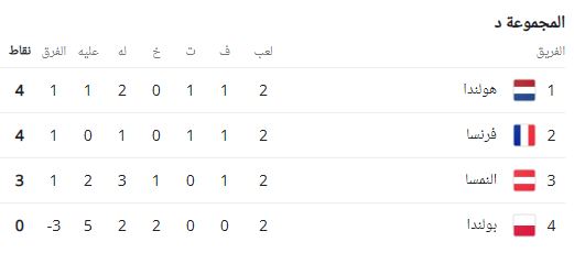 ويتصدر المنتخب الهولندي المجموعة برصيد 4 نقاط، متقدمًا على فرنسا بفارق الأهداف، وبعدهما تأتي النمسا بفارق نقطة واحدة.