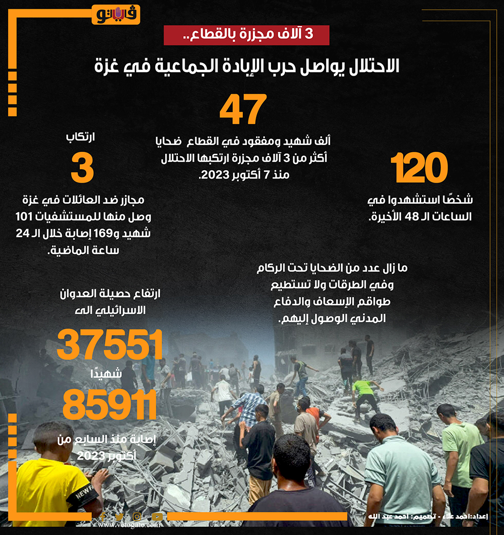 3 آلاف مجزرة بالقطاع.. الاحتلال يواصل حرب الإبادة الجماعية في غزة (إنفوجراف) الأحد 23/يونيو/2024 - 12:36 م 6/23/2024 12:36:19 PM غزة، فيتو احمد علاء شارك طباعة 18 حجم الخط شارك طباعة قطاع غزة جيش الاحتلال غزة طوفان الأقصى رفح