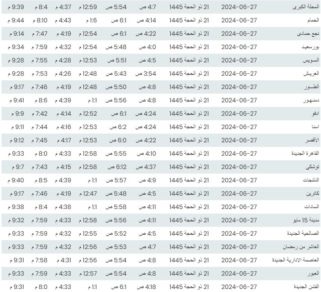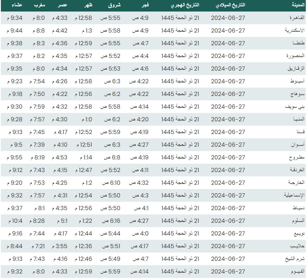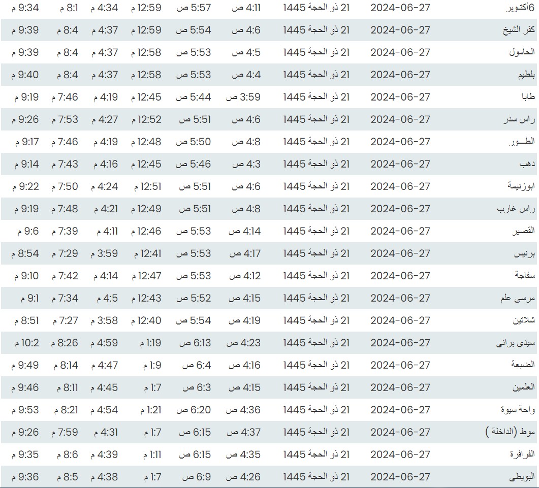 وفيما يلي مواقيت الصلاة، لعدد من مدن ومحافظات الجمهورية من واقع بيانات الهيئة العامة للمساحة
