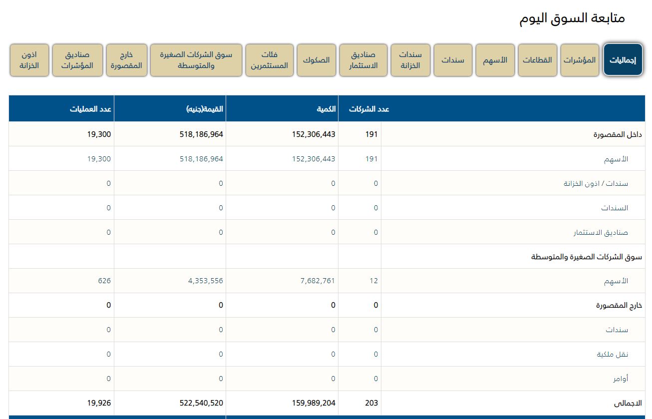 البورصة المصرية، ارتفعت مؤشرات البورصة المصرية بحركة تعاملات صباح اليوم الأحد الموافق 23 يونيو 2024، بإجمالى عدد تداولات بلغت 19 ألف عمليه تداول، ليرتفع مؤشر "إيجي إكس 30" بنسبة 0.77% عند مستوى 26.620.71 نقطة، كما صعد مؤشر الشركات الصغيرة والمتوسطة "إيجي إكس 70 متساوي الأوزان" بنسبة 1.14 % عند مستوى 5.997.26 نقطة، وصعد مؤشر "إيجي إكس 100 متساوي الأوزان" بنسبة 1.10 % ليغلق عند مستوى 8.650.34 نقطة، كما صعد مؤشر الشريعة الإسلامية بنسبة 0.59 % عند مستوى 2.625.19 نقطة.