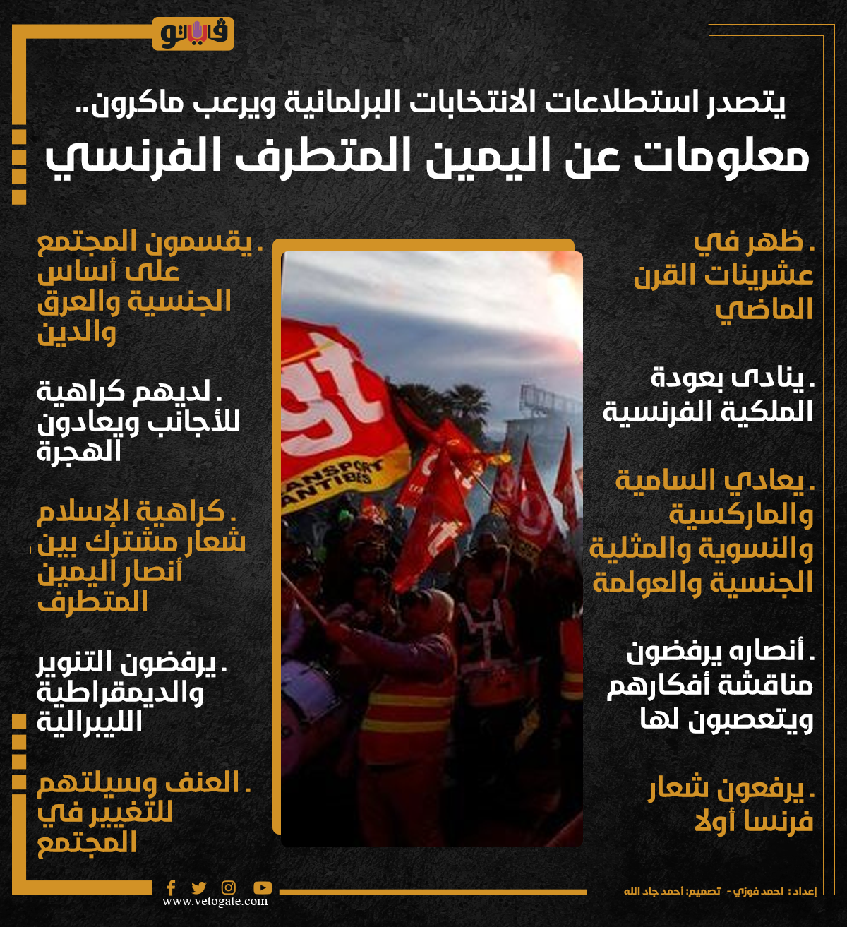 يتصدر استطلاعات الانتخابات البرلمانية ويرعب ماكرون.. معلومات عن اليمين المتطرف الفرنسي (إنفوجراف) الأربعاء 26/يونيو/2024 - 05:40 م 6/26/2024 5:40:29 PM أنصار اليمين المتطرف الفرنسي، فيتو احمد فوزي شارك طباعة 18 حجم الخط شارك طباعة اليمين المتطرف الفرنسي المثلية الجنسية اليمين المتطرف كراهية الإسلام مثلية ماكرون الليبرالية الماركسية