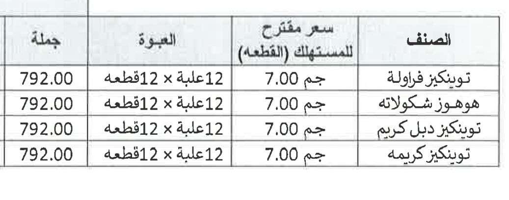 وأشار إلى أن سعر توينكيز فراولة / دبل كريم/ كريمة ارتفع إلى 7 جنيهات مقابل 5 جنيهات سعره السابق، ليصل سعر الجملة الكرتونة تحتوي على 12 علبة كل علبة بها 12 قطعة توينكيز نحو 792 جنيهًا.