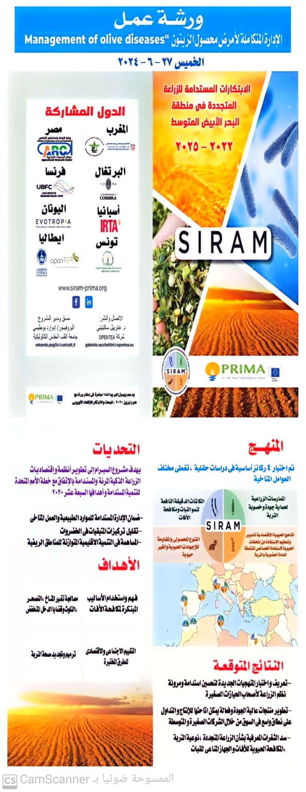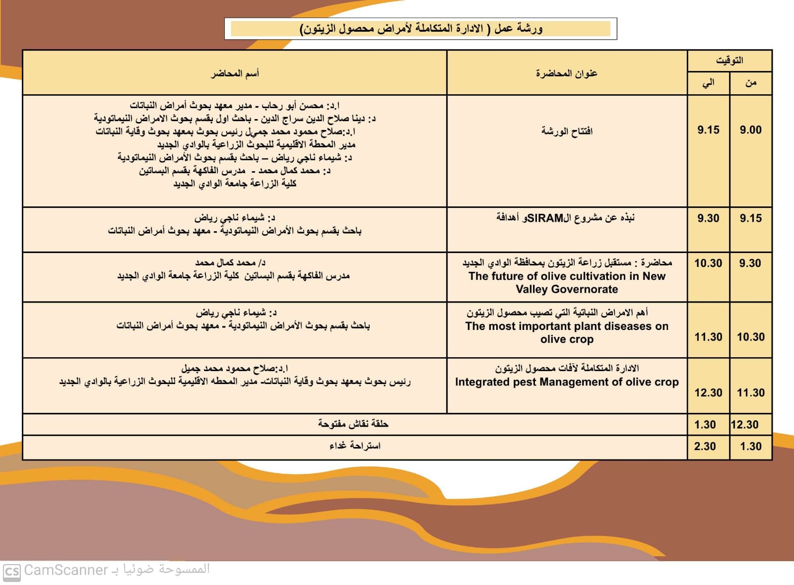 وتتناول الدكتورة شيماء ناجي رياض مقرر الورشة العلمية، والباحث بقسم بحوث الأمراض النيماتودية بمعهد بحوث أمراض النباتات، في محاضرتها نبذه عن مشروع الـ SIRAM وأهدافة، فيما يتناول الدكتور محمد كمال محمد مدرس الفاكهة بقسم البساتين كلية الزراعة جامعة الوادي الجديد، محاضرة بعنوان "مستقبل زراعة الزيتون بمحافظة الوادي الجديد