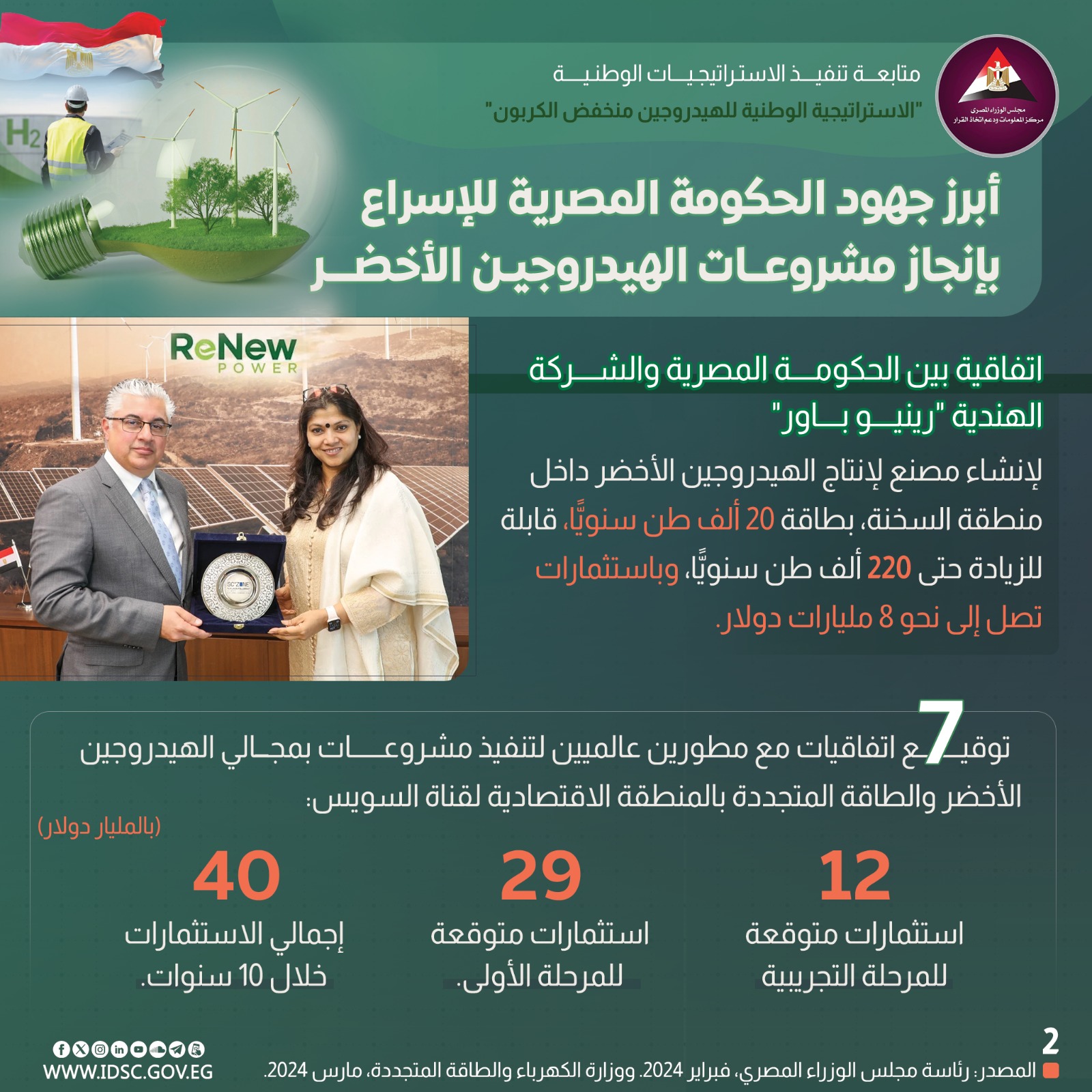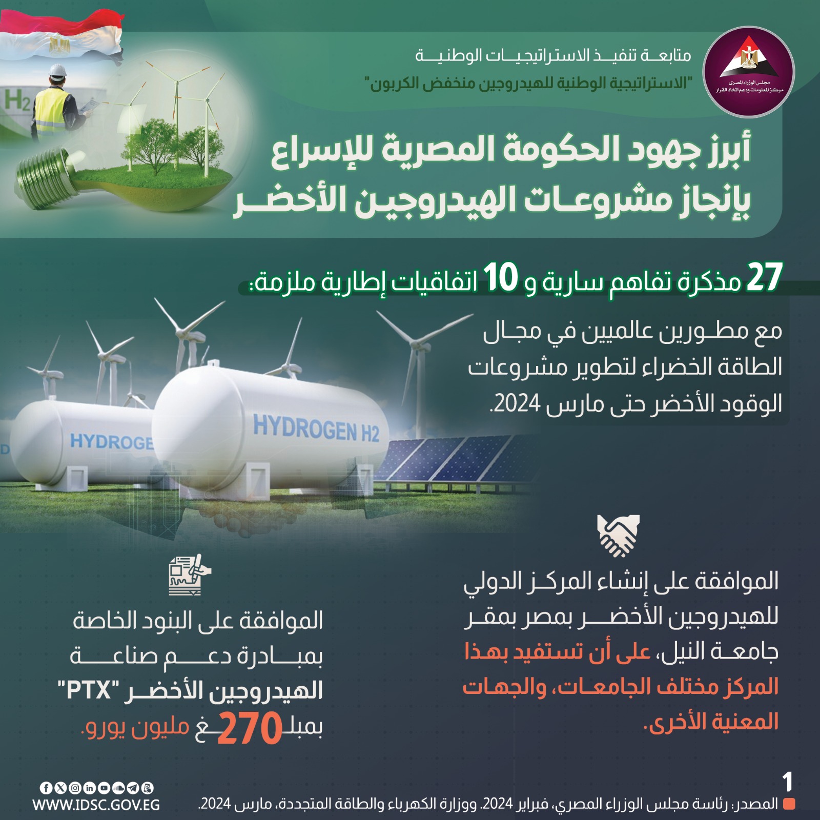 حيث تم توقيع عدد من مذكرات واتفاقيات التعاون مع عدد من الأطراف والشركات العالمية لتنفيذ مشروعات لإنتاج الهيدروجين الأخضر وتصديره، لتحويل مصر إلى ممر لعبور الطاقة النظيفة إلى أوروبا والعالم.