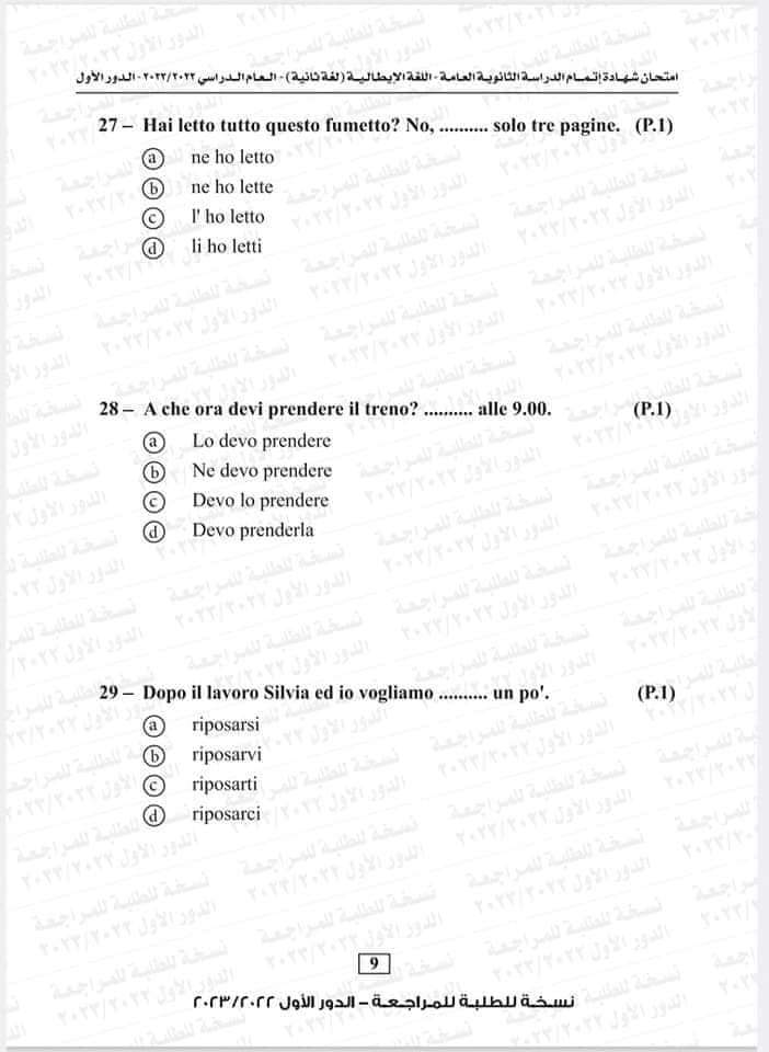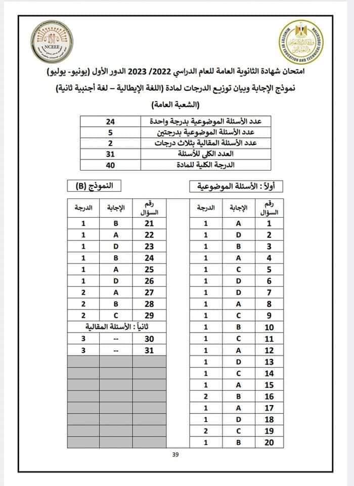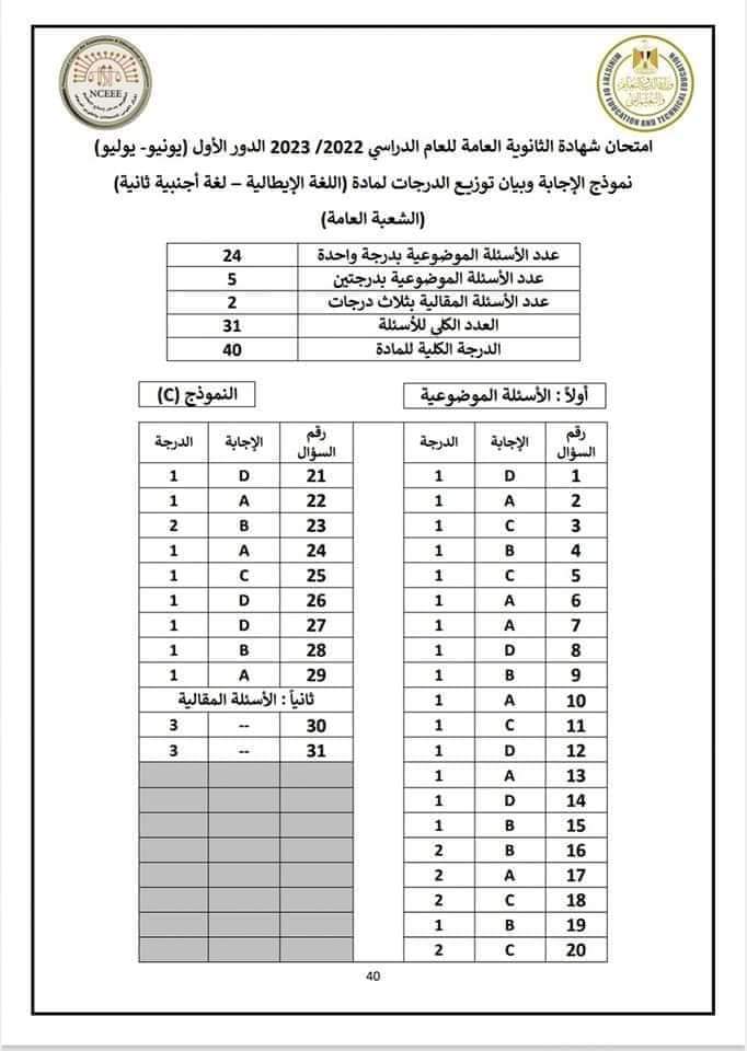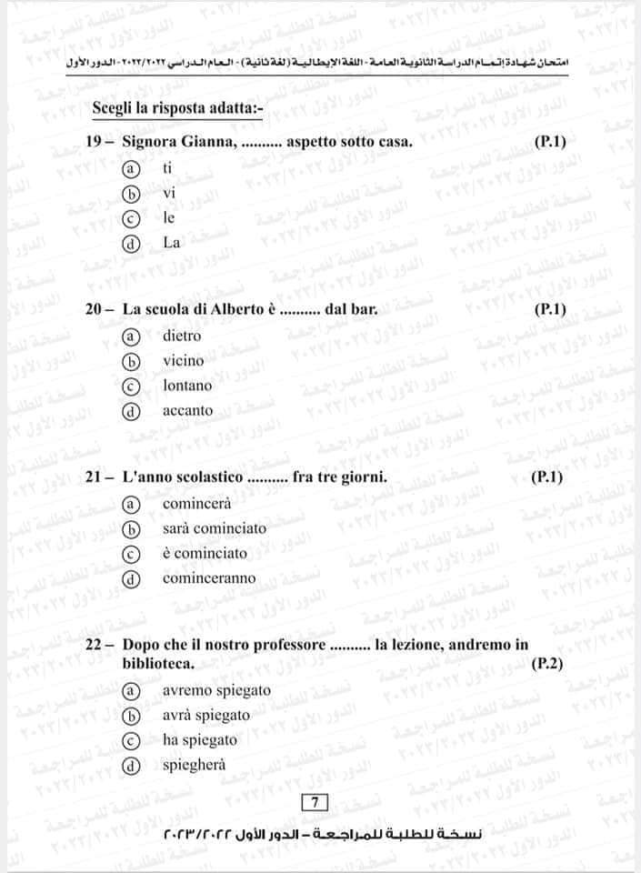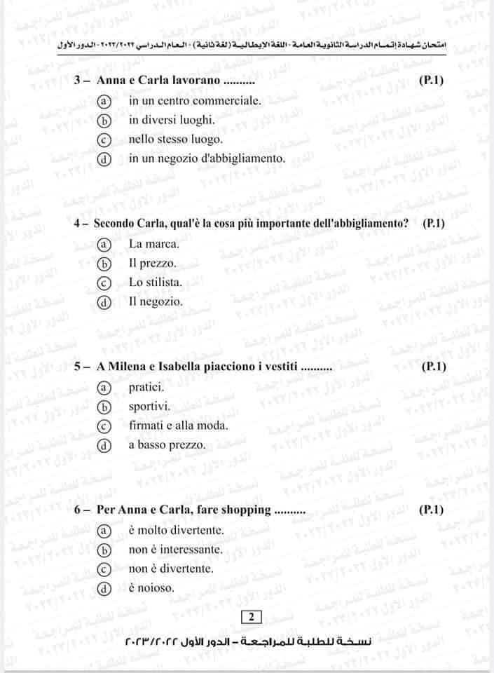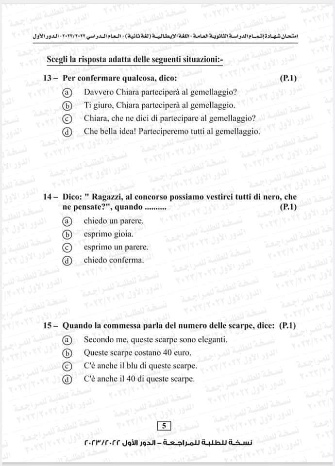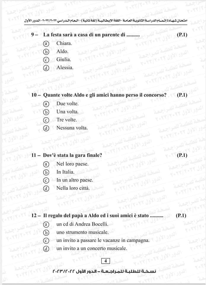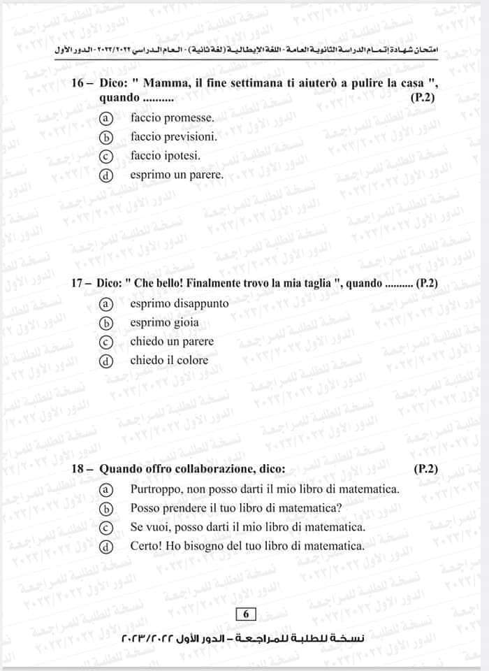 نموذج امتحان اللغة الإيطالية العام السابق 2023