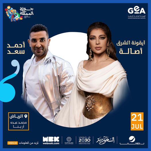 وتحيي الفنانة السورية أصالة حفل غنائي كبير مع أحمد سعد يوم 21 يوليو المقبل وذلك علي مسرح محمد عبده، ضمن جولة المملكة والفعاليات المصاحبة لكأس العالم للرياضيات الإليكترونية بالرياض.
