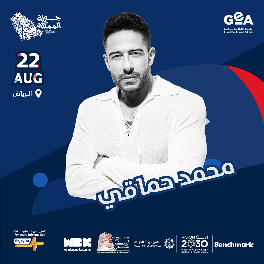 كما يحيي النجم محمد حماقي حفلا غنائيا علي مسرح أبو بكر سالم ضمن جولة المملكة والفعاليات المصاحبة لكأس العالم للرياضيات الإليكترونية بالرياض.
