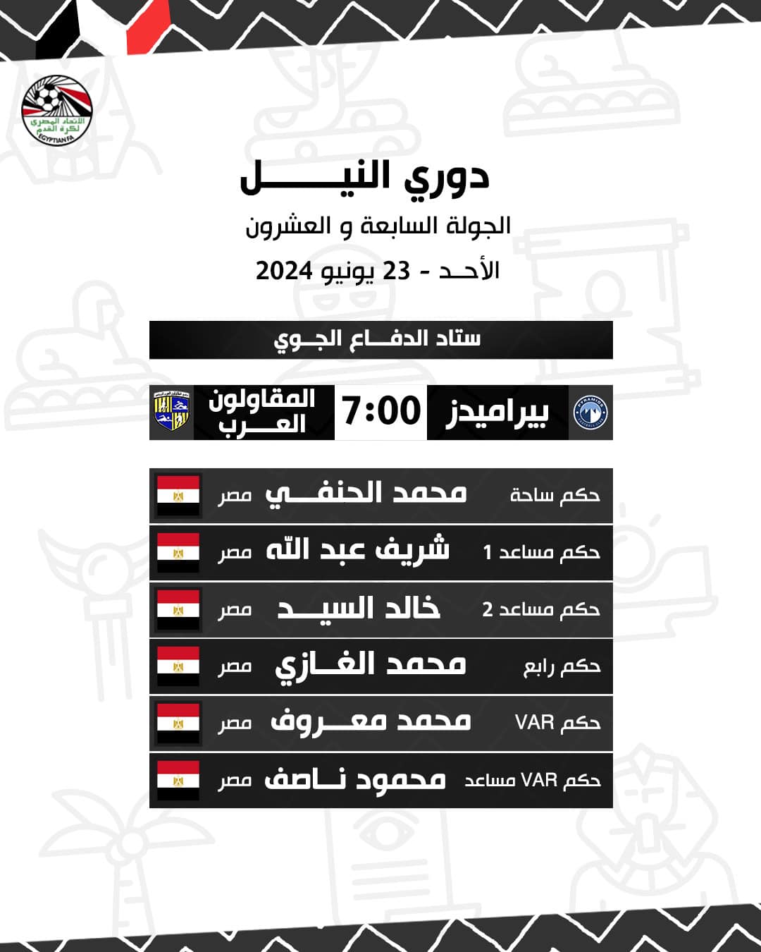 الدوري المصري، أعلنت لجنة الحكام الرئيسية بالاتحاد المصري لكرة القدم برئاسة البرتغالي فيتور بيريرا أسماء حكام مباريات اليوم الأحد، ضمن منافسات الجولة 27 من الدوري المصري الممتاز.. وجاءت على النحو التالي: