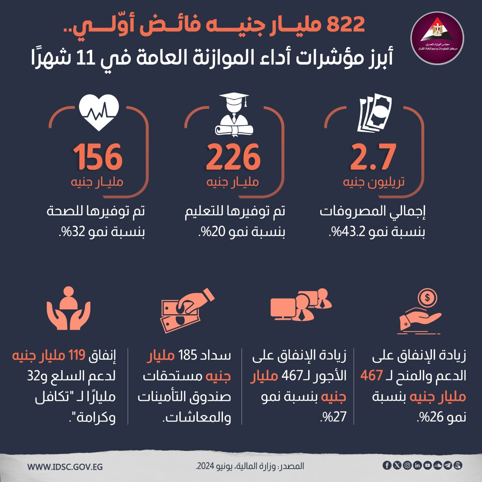 822 مليار جنيه فائض أولي، أبرز مؤشرات أداء الموازنة في 11 شهرا (إنفوجراف)