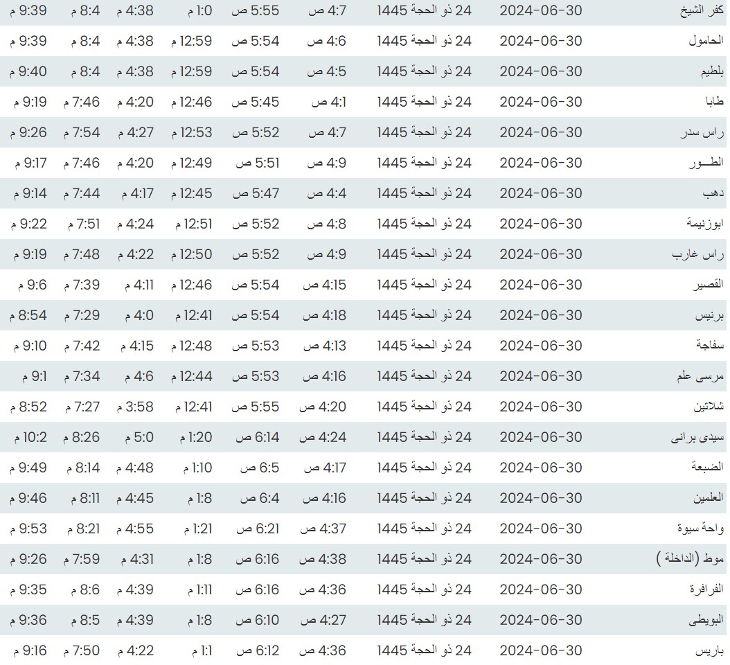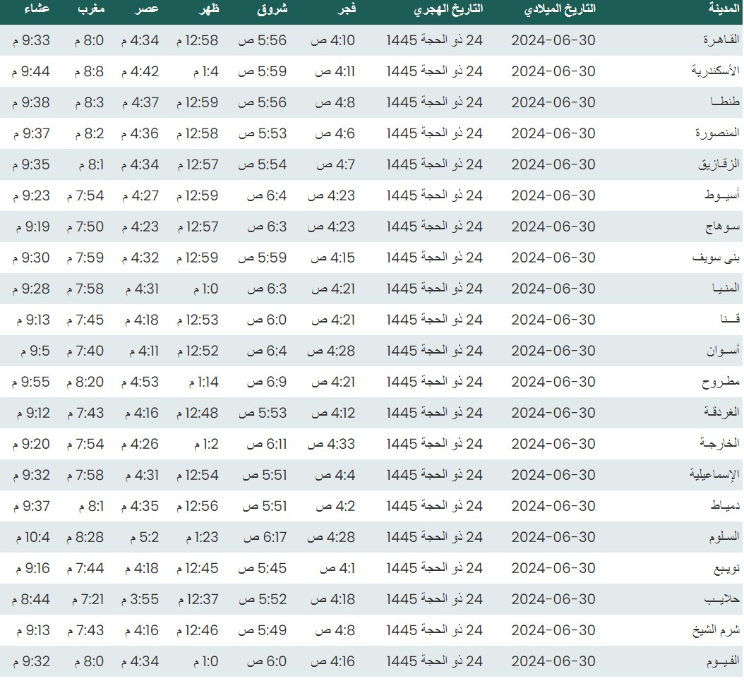 وفيما يلي مواقيت الصلاة، لعدد من مدن ومحافظات الجمهورية من واقع بيانات الهيئة العامة للمساحة