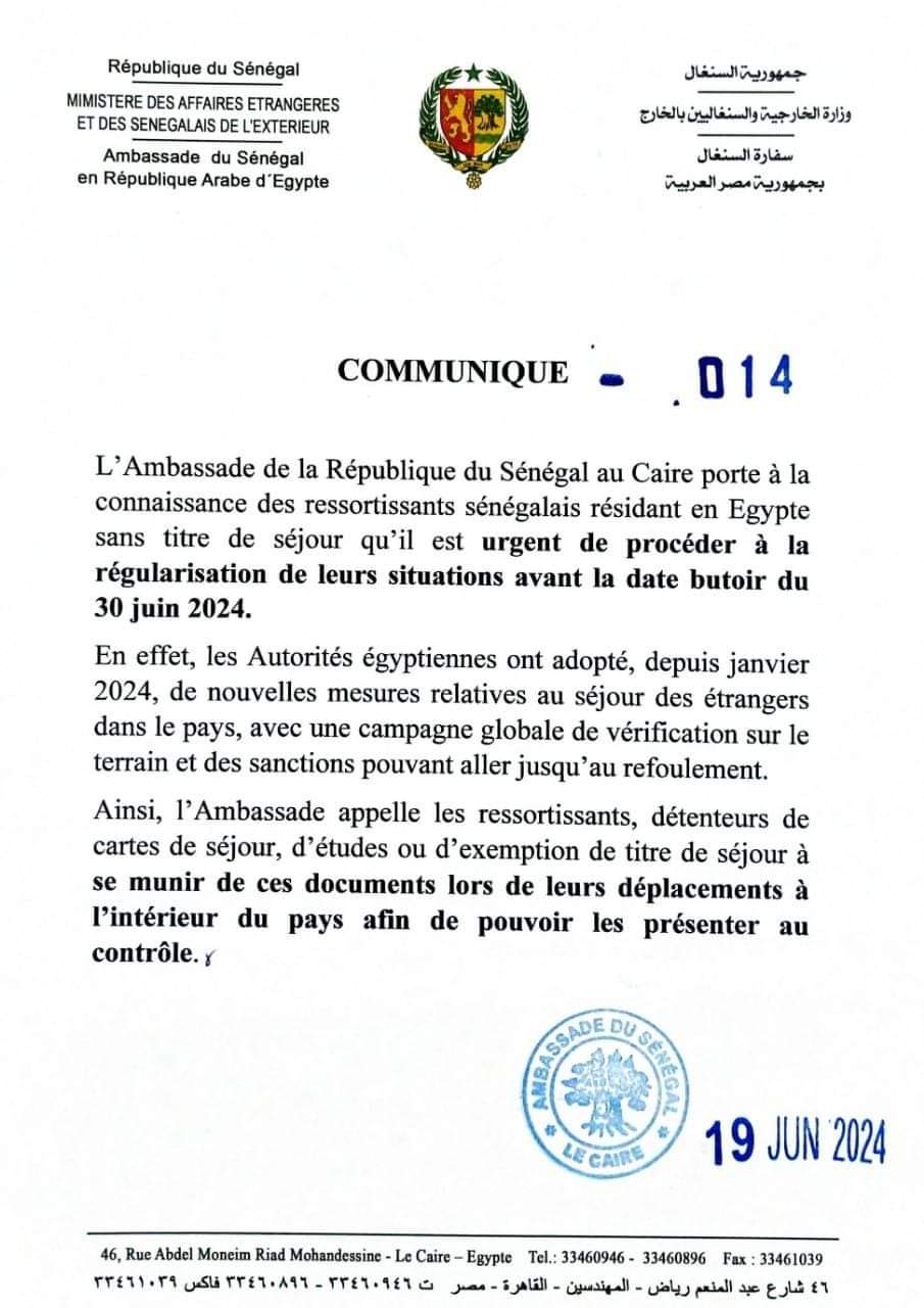 نشرت سفارة السنغال بالقاهرة، اليوم الاثنين، منشورًا تحيط من خلاله المواطنين السنغاليين المقيمين في مصر الذين ليس لهم بطاقة إقامة أنه من الضروري المضي قدما في الحصول على الإقامة قبل الموعد النهائي 30 من يونيو للعام الجاري 2024.