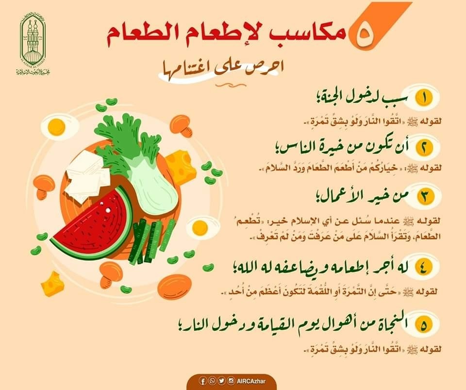 عدد مجمع البحوث الإسلامية في الأزهر الشريف مكاسب لإطعام الطعام، مطالبا بالحرص على اغتنام الفرصة، حيث إن المواظبة عليها لها مكاسب عظيمة، وهي التالي: