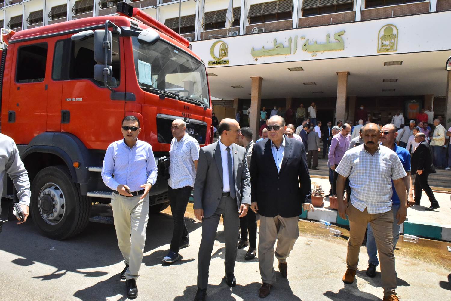 محافظ أسيوط يتفقد آثار حريق وحدة الحاسب الآلي بكلية الطب (صور)