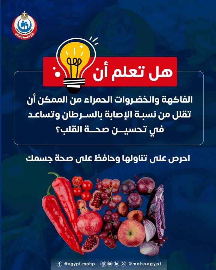 ونصحت وزارة الصحة بأهمية تناول الخضروات والفواكه الحمراء يوميا حفاظا علي الصحة.