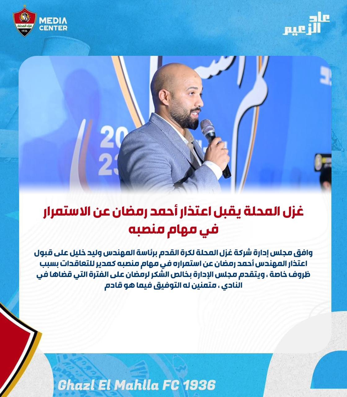 ووافق مجلس شركة غزل المحلة لكرة القدم برئاسة المهندس وليد خليل على قبول اعتذار المهندس أحمد رمضان عن استمراره في منصبه، كما تقدم مجلس الإدارة المحلة بخالص الشكر لرمضان على الفترة التي قضاها في النادي.