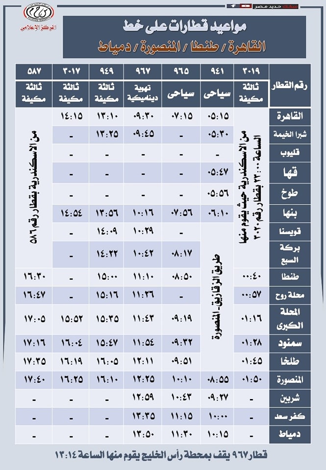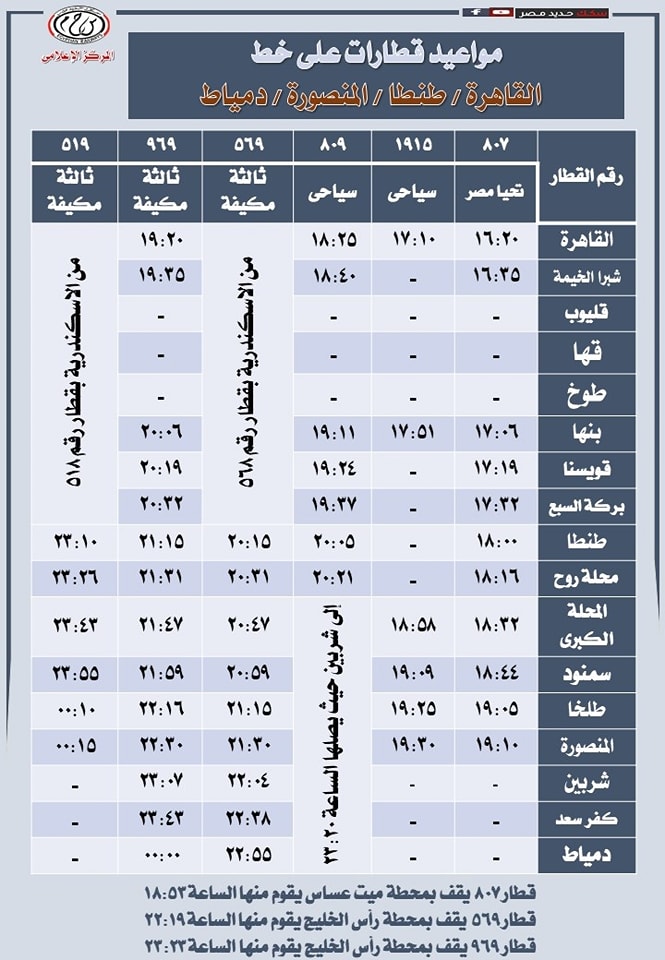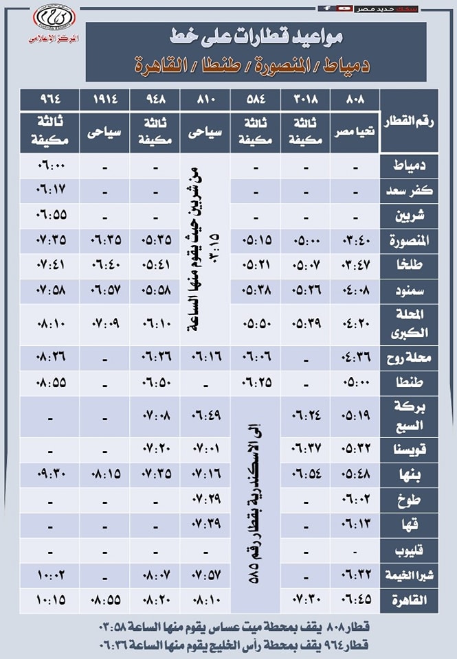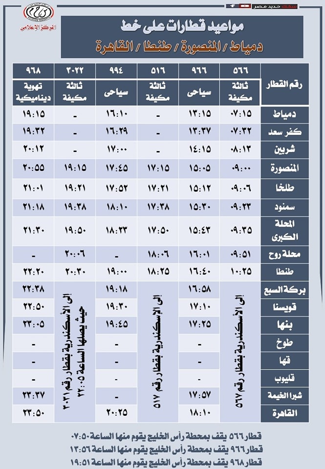 ونشرت الهيئة القومية لسكك حديد مصر جداول مواعيد تشغيل القطارات على عدد من الخطوط على رأسها خط القاهرة المنصورة للتيسير على الركاب كالتالي: