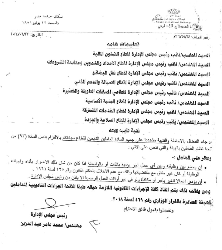 اعتمد رئيس هيئة السكة الحديد منشورا بالتنبيه مشدددا على جميع العاملين التابعين بالالتزام بنص المادة (۹۳) من لائحة نظام العاملين بالهيئة والتي تنص علي الآتي :