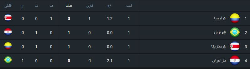 كولومبيا في الصدارة، ترتيب مجموعة البرازيل في كوبا أمريكا بعد الجولة الأولى