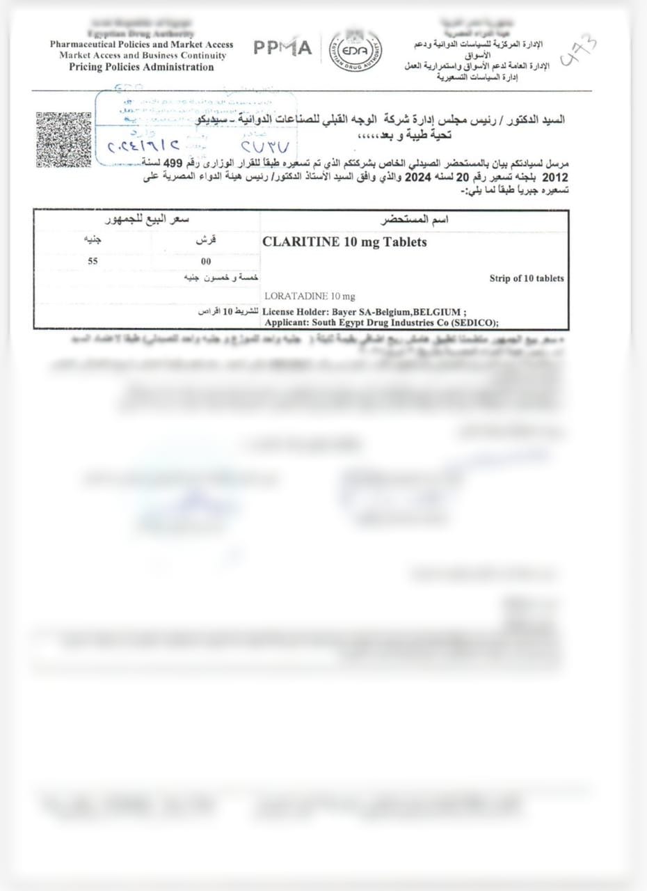 أصدرت إدارة السياسات التسعيرية بهيئة الدواء المصرية قرارا بالموافقة على زيادة سعر دواء كلاريتين 10 مجم أقراص إلى 55 جنيها للشريط الواحد.