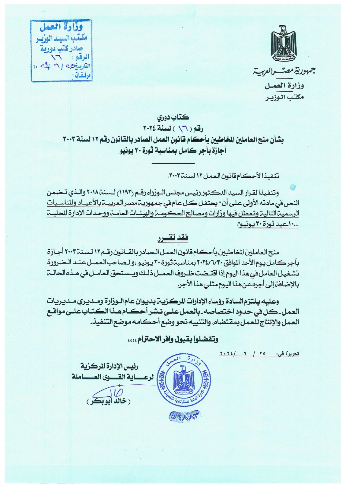 وأصدرت الوزارة كتابًا دوريًا بذلك إلى مديريات العمل بالمحافظات لنشر أحكامه على مواقع العمل والإنتاج للعمل بمقتضاه.
