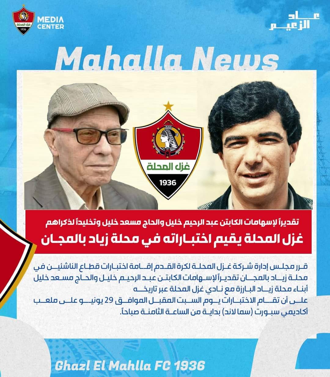 اختبارات الناشئين، قرر مجلس إدارة شركة غزل المحلة لكرة القدم إقامة اختبارات قطاع الناشئين في محلة زياد بالمجان تقديرًا لإسهامات الكابتن عبد الرحيم خليل ومسعد خليل "ابني محلة زياد" البارزة مع نادي غزل المحلة عبر تاريخه.