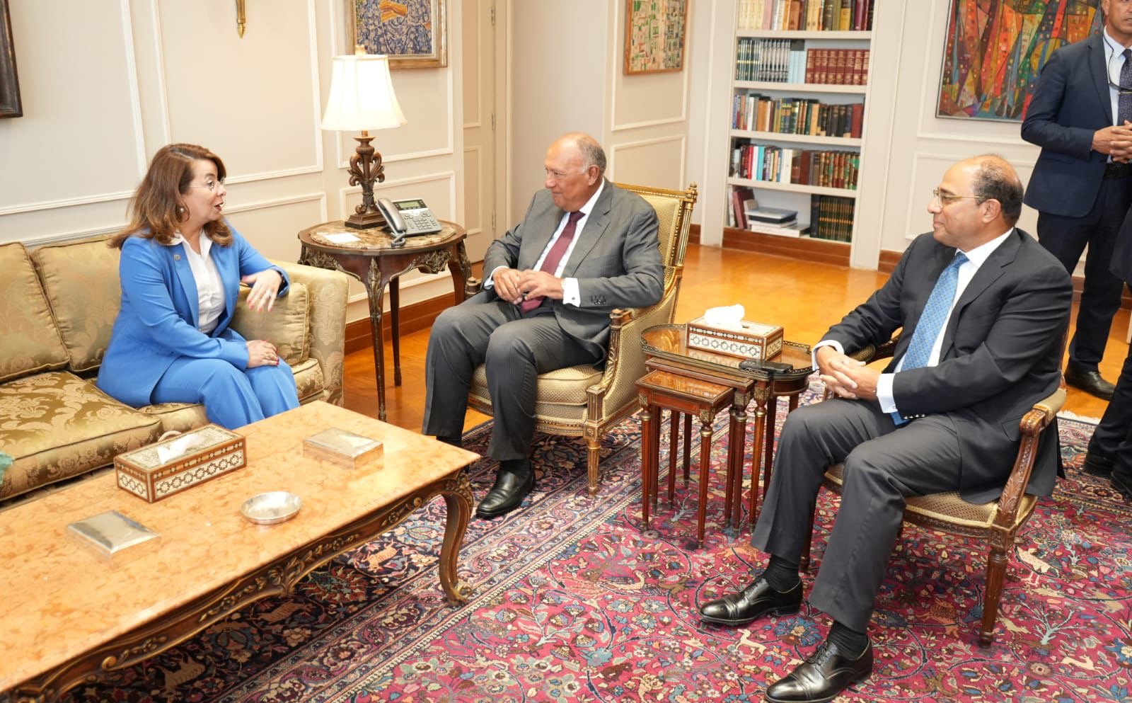من جانبها، حرصت المديرة التنفيذية لمكتب الأمم المتحدة المعنى بالمخدرات والجريمة على إطلاع وزير الخارجية على المبادرات والمشروعات التي يقوم المكتب بتنفيذها في مصر، ومن ضمنها مشروع "مكافحة الفساد وغسل الأموال في منطقة الشرق الأوسط وشمال أفريقيا"، و"برنامج تحسين إدارة الهجرة"، ومشروع "الإدارة المتكاملة للحدود".