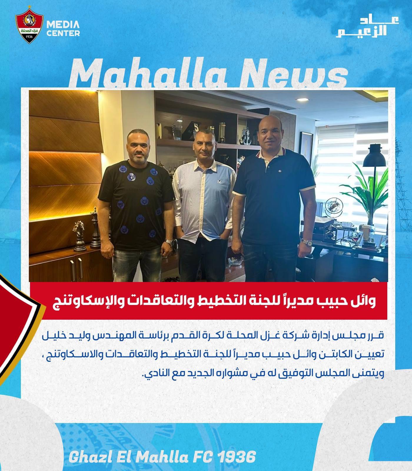 وكتب نادي غزل المحلة عبر صفحته الرسمية علي موقع التواصل الاجتماعي فيسبوك: “ قرر مجلس إدارة شركة غزل المحلة لكرة القدم برئاسة المهندس وليد خليل تعيين الكابتن وائل حبيب مديرًا للجنة التخطيط والتعاقدات والاسكاوتنج”.