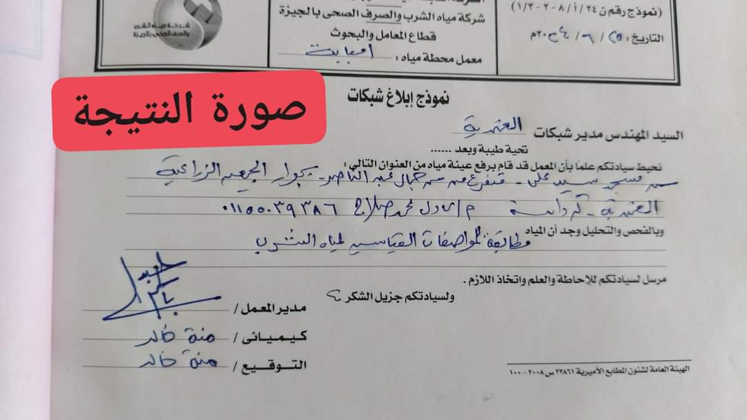 وبناء علي تكليف محافظ الجيزة قد انتقلت اللجنة للمنطقة محل الشكوى وتم سحب عينات من المياه لفحص جودتها ومدي اختلاطها بأي شوائب حيث تم تحليلها بمعامل شركة مياه الشرب والصرف الصحي المتخصصة والمعتمدة وتبين جودة المياه وخلوها من اي مشكلات وسلامتها للاستخدام الآدمي.